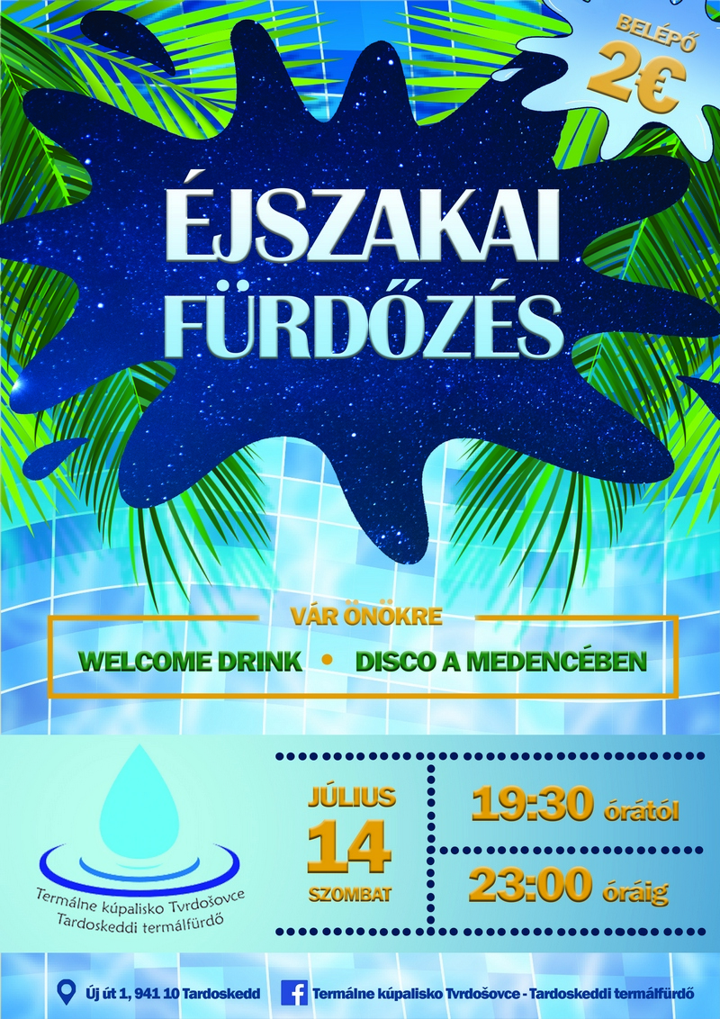 Szeretettel várjuk azokat az érdeklődőket is a helyi termálfürdőbe, akik július 14-én este csak fürdeni szeretnének. Őket éjszakai fürdőzés, welcome drink és disco várja a medencében 19.30 – 23.00 óráig. A belépő 2 €.