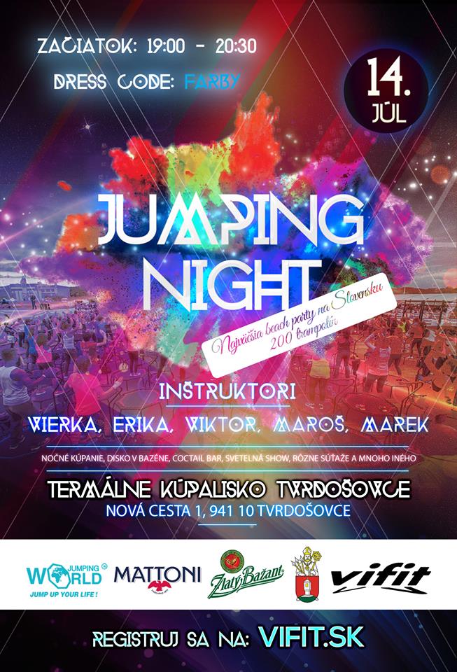 Szeretettel meghívunk mindenkit 2018. július 14-én a Tardoskeddi Termálfürdőbe, ahol este 7-től fél 9-ig Jumping night lesz, egy igazi trambulinos beach party 200 trambulinnal. TOP edzők vezetésével lehet majd trambulinon tornázni. Ezenkívül lesz éjszakai fürdőzés, medencés diszkó, coctail bár, különféle versenyek és egyéb érdekességek. Ne habozzanak, regisztráljanak a vifit.sk-n és jöjjenek el. Mindenkit szeretettel várunk!