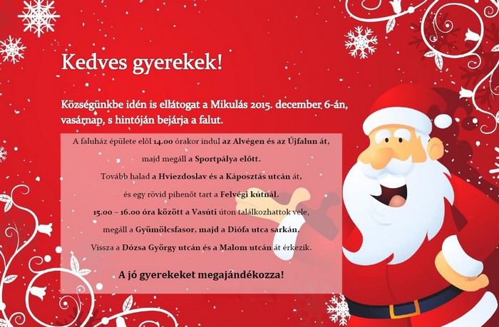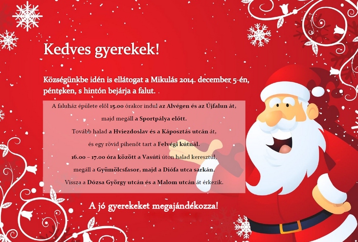 December 6. (vasárnap) 14.00 – idén is várjuk a MIKULÁS érkezését községünkbe, aki hintón járja be a falu utcáit. Kedves gyerekek! Figyeljétek a csengőszót, és ha meghalljátok, siessetek ki az utcára, mert valószinűleg felétek jár a jó Mikulás, aki minden jó gyereket megjutalmaz!