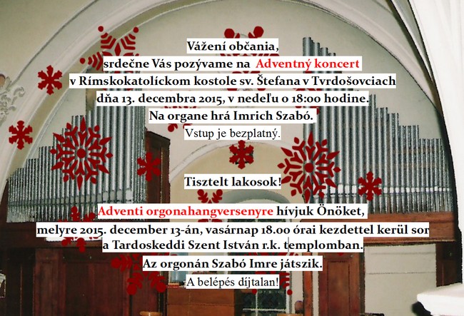 December 13. (vasárnap) 18.00 – Adventi orgonahangverseny a helyi templomban. Fellép: Szabó Imre, orgonaművész.