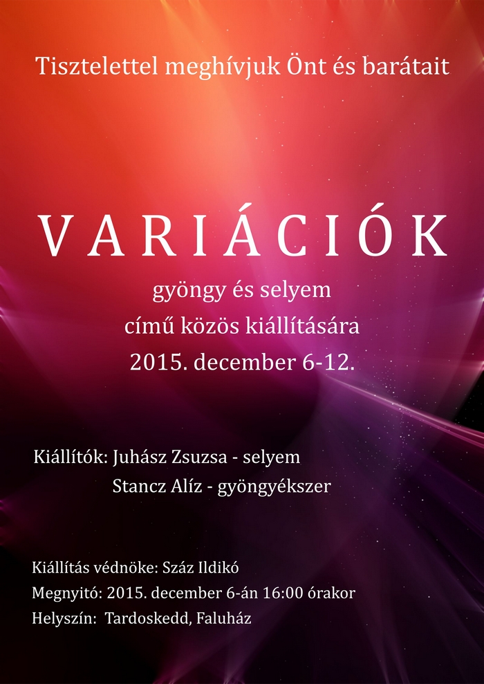 December 6. (vasárnap) 16.00 – „Variációk selyemre és gyöngyre“ c. kiállítás megnyitója