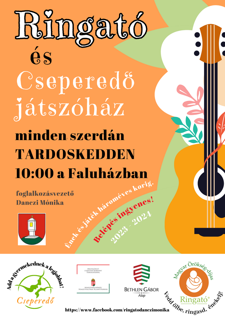 A Cseperedő program jóvoltából a belépés ingyenes, további információk és bejelentkezés a Ringató Tardoskedd facebook oldalon. Vidám hangulattal, kedves közösséggel, és a Ringató után kivételes játszóházzal vár minden kisgyermekes családot Danczi Mónika Ringató foglalkozásvezető.
